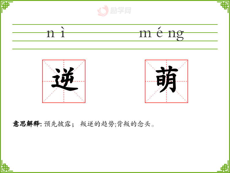 逆萌的意思是:预先披露; 叛逆的趋势;背叛的念头。