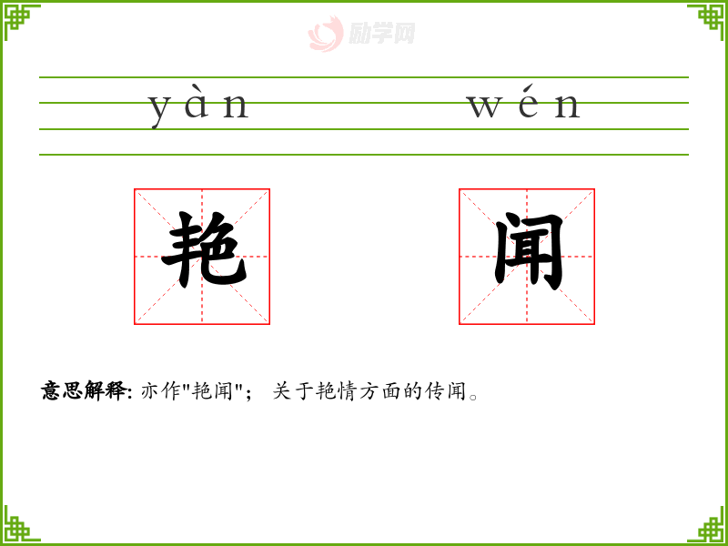 艳闻的意思是:亦作"艳闻"; 关于艳情方面的传闻。