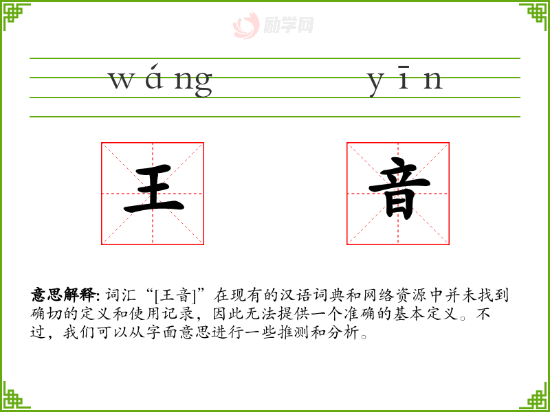词汇“[王音]”在现有的汉语词典和网络资源中并未找到确切的定义和使用记录,因此无法提供一个准确的基本定义。不过,我们可以从字面意思进行一些推测和分析。
