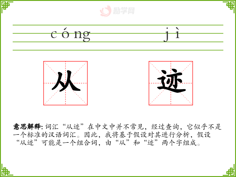 词汇“从迹”在中文中并不常见,经过查询,它似乎不是一个标准的汉语词汇。因此,我将基于假设对其进行分析,假设“从迹”可能是一个组合词,由“从”和“迹”两个字组成。