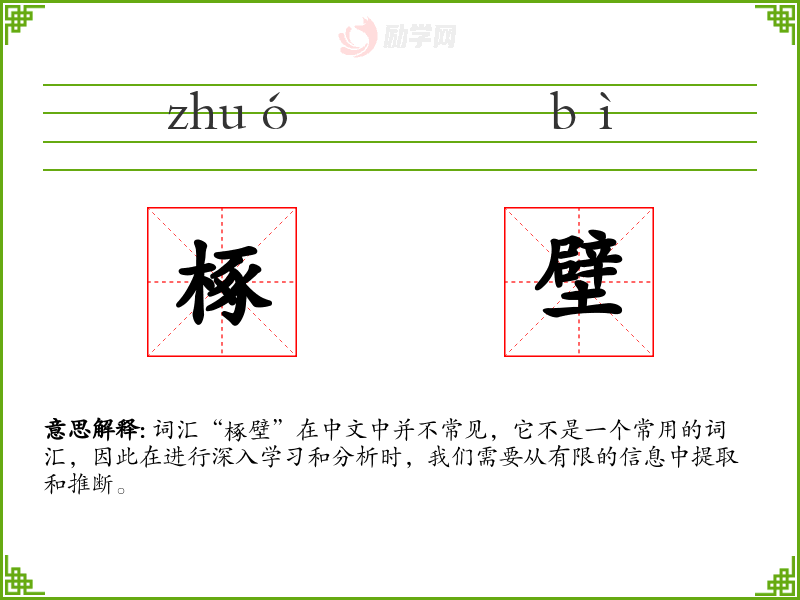 词汇“椓壁”在中文中并不常见,它不是一个常用的词汇,因此在进行深入学习和分析时,我们需要从有限的信息中提取和推断。
