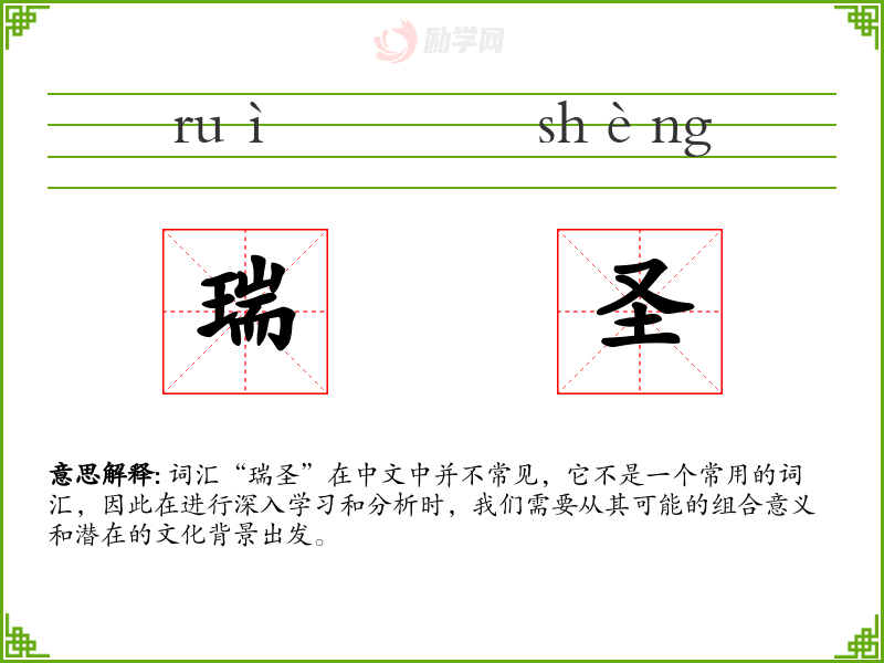 词汇“瑞圣”在中文中并不常见,它不是一个常用的词汇,因此在进行深入学*和分析时,我们需要从其可能的组合意义和潜在的文化背景出发。