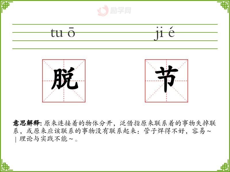脱节的意思是:原来连接着的物体分开,泛借指原来联系着的事物失掉联系,或原来应该联系的事物没有联系起来:管子焊得不好,容易~|理论与实践不能~。