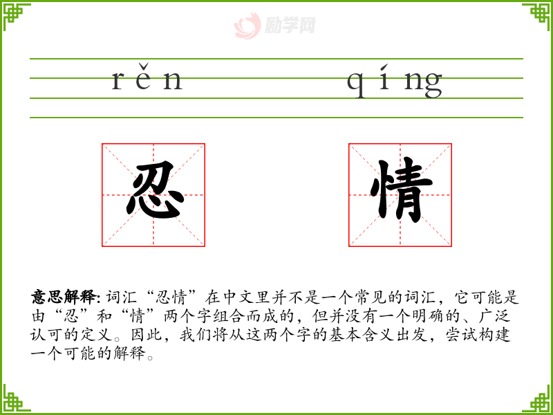 词汇“忍情”在中文里并不是一个常见的词汇,它可能是由“忍”和“情”两个字组合而成的,但并没有一个明确的、广泛认可的定义。因此,我们将从这两个字的基本含义出发,尝试构建一个可能的解释。