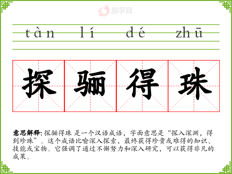 在我的学*和工作中,我经常遇到需要深入研究和探索的问题。每当我感到困难重重时,我就会想起探骊得珠 这个成语,它提醒我要坚持不懈,最终一定能够获得宝贵的知识和经验。