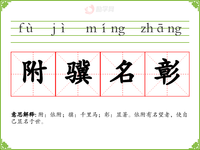 附骥名彰的意思是:附:依附;骥:千里马;彰:显著。依附有名望者,使自己显名于世。