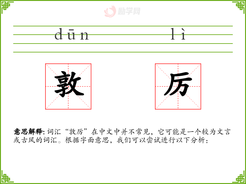 词汇“敦厉”在中文中并不常见,它可能是一个较为文言或古风的词汇。根据字面意思,我们可以尝试进行以下分析: