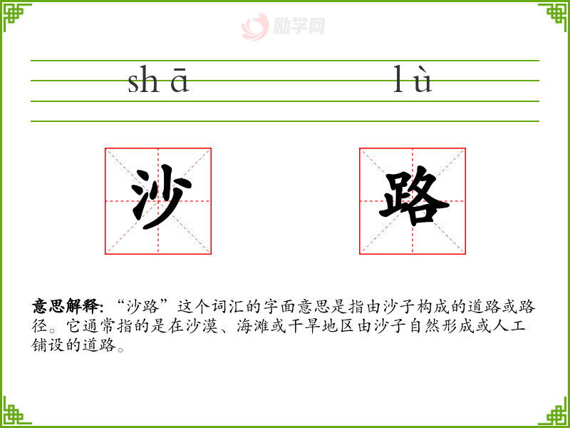 “沙路”这个词汇的字面意思是指由沙子构成的道路或路径。它通常指的是在沙漠、海滩或干旱地区由沙子自然形成或人工铺设的道路。