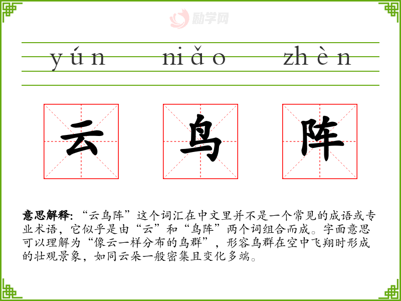 (可以结合鸟群飞翔的视频或图片,以及鸟鸣的声音,来增强对“云鸟阵”这个词汇的视觉和听觉联想。)