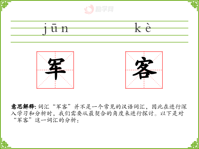 “军客”这一词汇在汉语中并不常见,其使用和含义可能需要根据具体语境来解释。在学习语言和表达时,了解和掌握常用词汇更为重要,而这类特殊词汇的学习可能更多地依赖于特定的语境和需求。