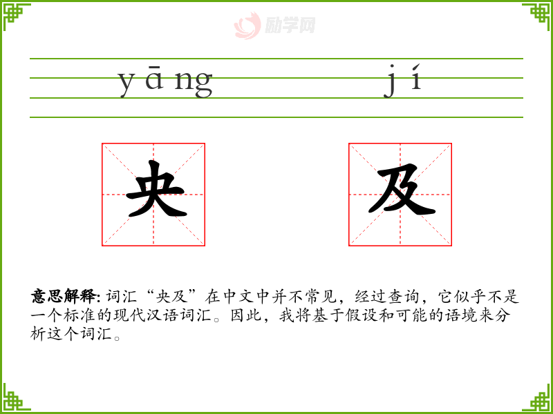 词汇“央及”在中文中并不常见,经过查询,它似乎不是一个标准的现代汉语词汇。因此,我将基于假设和可能的语境来分析这个词汇。