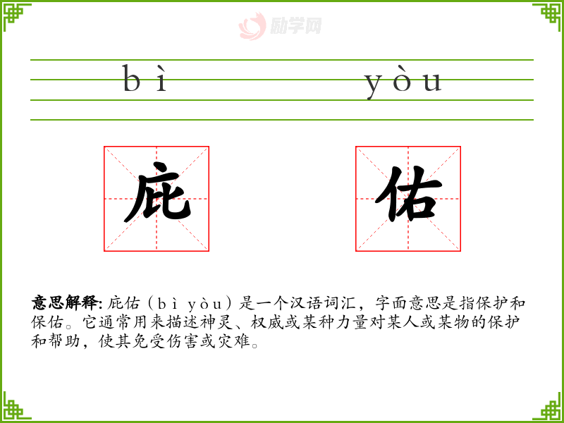 - 文学:在文学作品中,庇佑常常用来描绘神灵或超自然力量对主人公的保护,如“神明庇佑,他得以逃脱险境。”