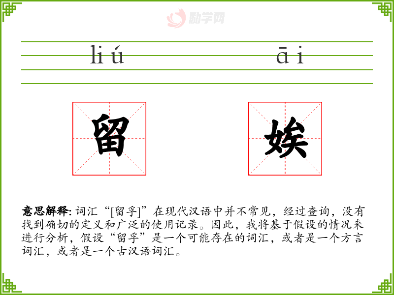 词汇“[留孚]”在现代汉语中并不常见,经过查询,没有找到确切的定义和广泛的使用记录。因此,我将基于假设的情况来进行分析,假设“留孚”是一个可能存在的词汇,或者是一个方言词汇,或者是一个古汉语词汇。
