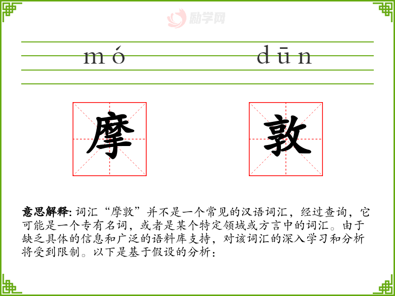 综上所述,由于“摩敦”不是一个常见的汉语词汇,且缺乏具体的信息和语料库支持,对其进行深入学习和分析存在困难。如果能够提供更多的上下文信息或者明确其来源和用途,可能会更有助于进行详细的分析。