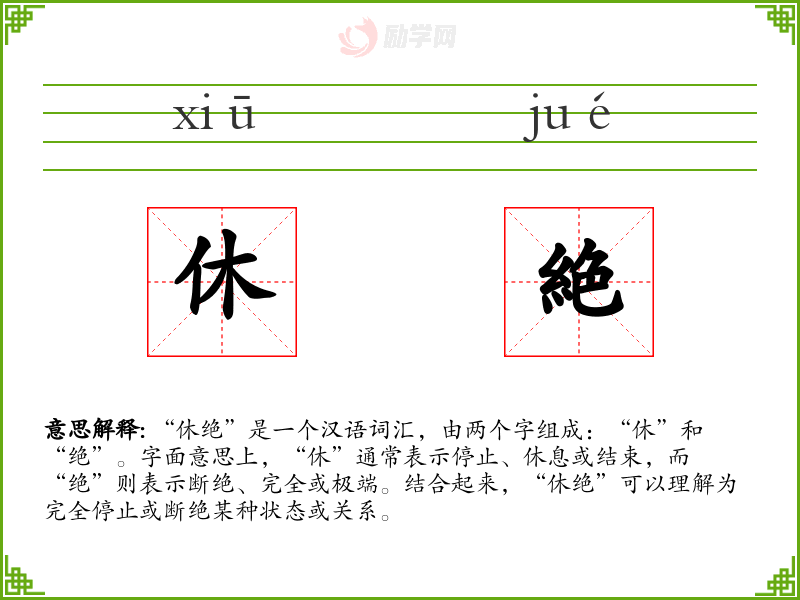 “休绝”是一个汉语词汇,由两个字组成:“休”和“绝”。字面意思上,“休”通常表示停止、休息或结束,而“绝”则表示断绝、完全或极端。结合起来,“休绝”可以理解为完全停止或断绝某种状态或关系。