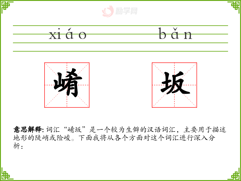 - 专业领域:在地理学或地质学中,可能会用“崤坂”来形容某些地形的特征。