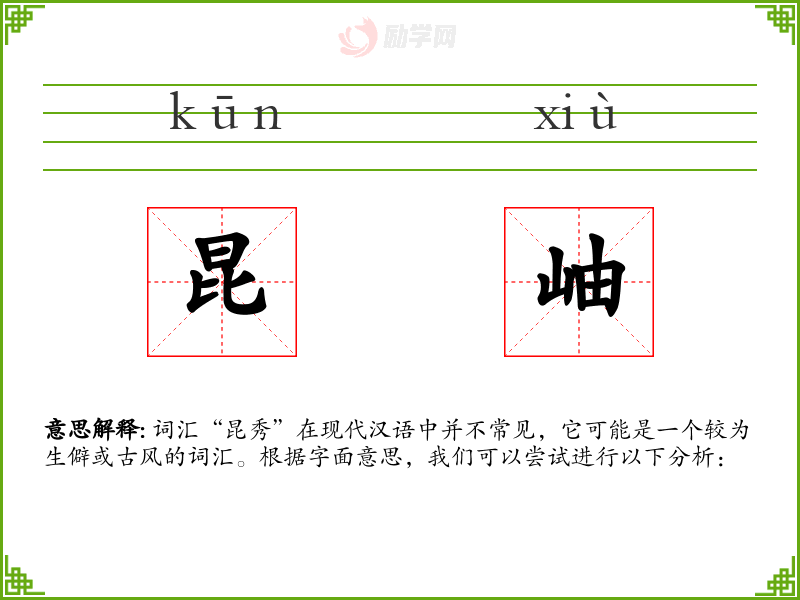 词汇“昆秀”在现代汉语中并不常见,它可能是一个较为生僻或古风的词汇。根据字面意思,我们可以尝试进行以下分析: