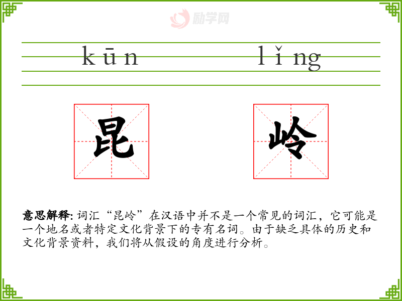 词汇“昆岭”在汉语中并不是一个常见的词汇,它可能是一个地名或者特定文化背景下的专有名词。由于缺乏具体的历史和文化背景资料,我们将从假设的角度进行分析。