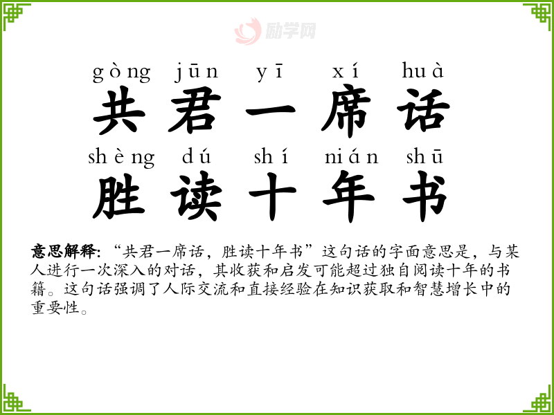 “共君一席话,胜读十年书”这句话的字面意思是,与某人进行一次深入的对话,其收获和启发可能超过独自阅读十年的书籍。这句话强调了人际交流和直接经验在知识获取和智慧增长中的重要性。