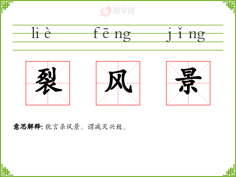 裂风景的意思是:犹言杀风景。谓减灭兴致。