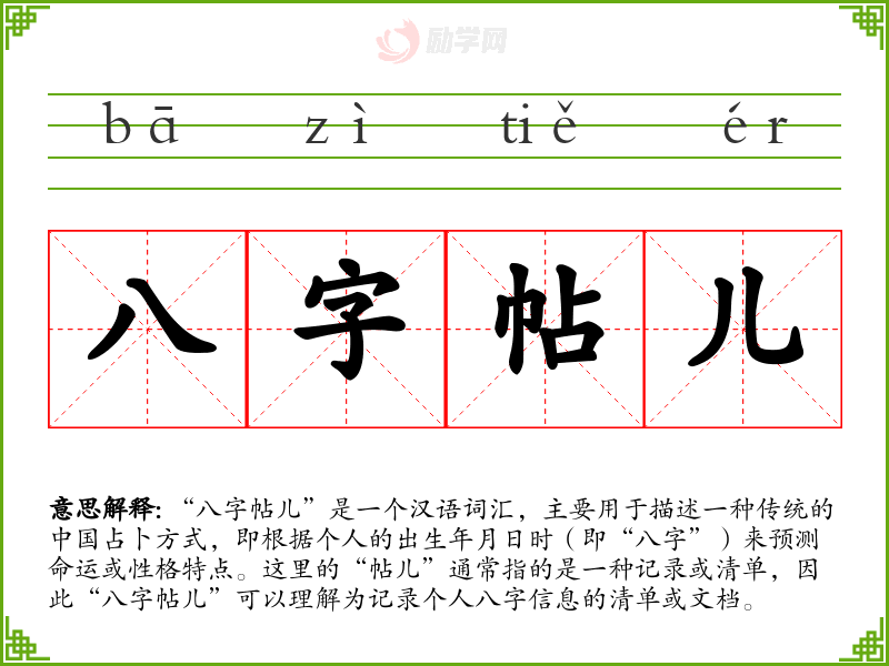 - 专业领域:在命理学或风水学等专业领域,“八字帖儿”是一个专业术语,用于指代详细的个人命理分析。