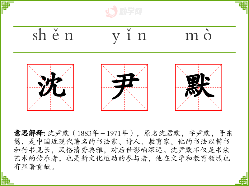 同义词:沈君默(原名)、书法大师、文化名人 反义词:无名之辈、非专业人士