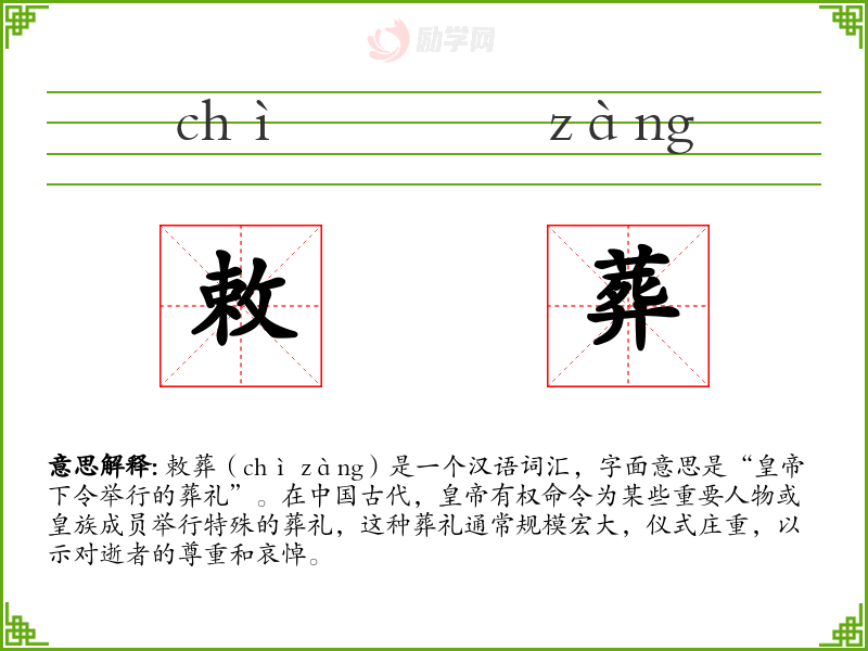 敕葬是一个充满历史和文化内涵的词汇。它不仅描述了一种特殊的葬礼形式,还反映了古代社会的等级制度和礼仪规范。在语言学*和表达中,理解这样的词汇有助于我们更深入地了解和欣赏古代文化。