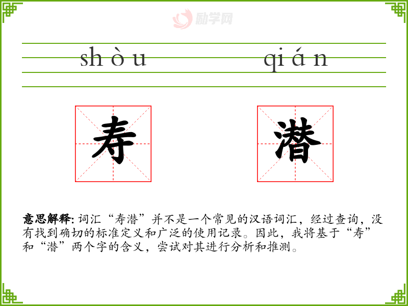 词汇“寿潜”并不是一个常见的汉语词汇,经过查询,没有找到确切的标准定义和广泛的使用记录。因此,我将基于“寿”和“潜”两个字的含义,尝试对其进行分析和推测。