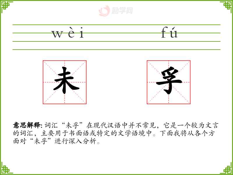 “未孚”是一个富有文化底蕴的词汇,虽然在现代汉语中使用频率不高,但它能够丰富语言表达的层次和深度。在学*语言时,了解和掌握这样的词汇有助于提升语言的精确性和表现力。
