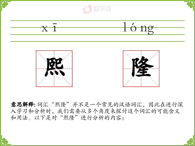 词汇“熙隆”并不是一个常见的汉语词汇,因此在进行深入学*和分析时,我们需要从多个角度来探讨这个词汇的可能含义和用法。以下是对“熙隆”进行分析的内容:
