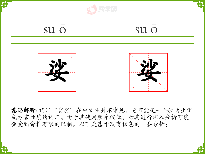 词汇“娑娑”在中文中并不常见,它可能是一个较为生僻或方言性质的词汇。由于其使用频率较低,对其进行深入分析可能会受到资料有限的限制。以下是基于现有信息的一些分析: