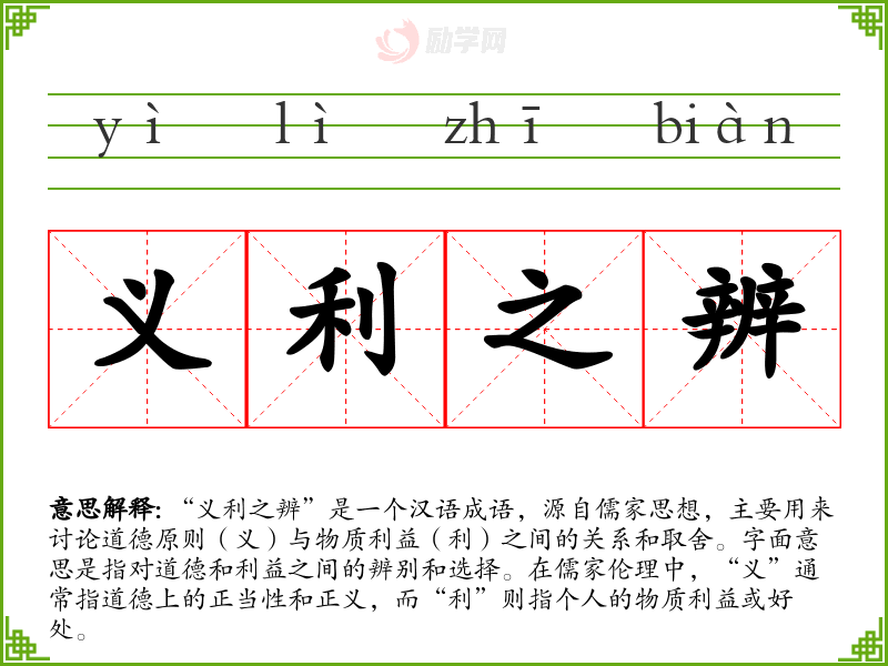 “义利之辨”是一个汉语成语,源自儒家思想,主要用来讨论道德原则(义)与物质利益(利)之间的关系和取舍。字面意思是指对道德和利益之间的辨别和选择。在儒家伦理中,“义”通常指道德上的正当性和正义,而“利”则指个人的物质利益或好处。