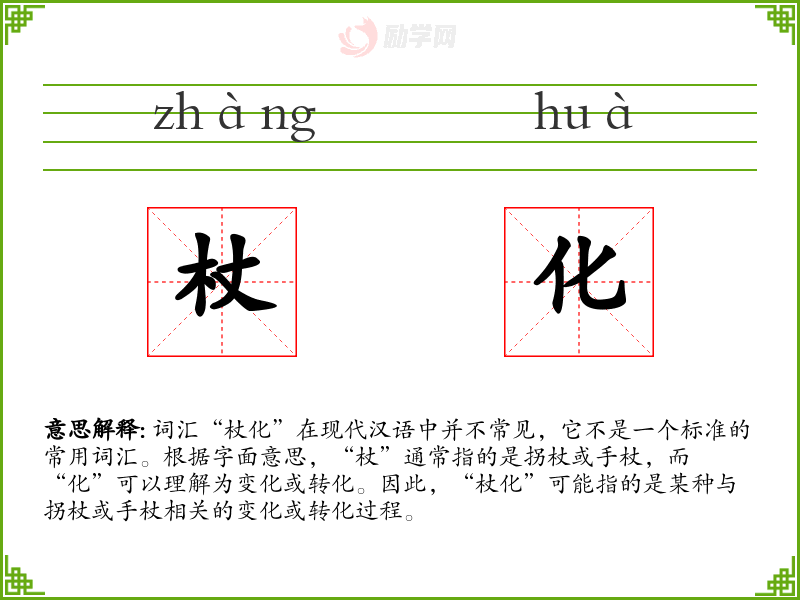 词汇“杖化”在现代汉语中并不常见,它不是一个标准的常用词汇。根据字面意思,“杖”通常指的是拐杖或手杖,而“化”可以理解为变化或转化。因此,“杖化”可能指的是某种与拐杖或手杖相关的变化或转化过程。