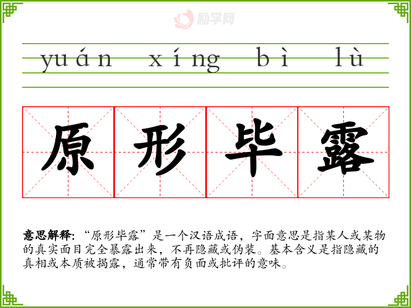 - 文学:在文学作品中,这个成语常用来描述人物在特定情境下暴露出其真实性格或动机,如《红楼梦》中贾宝玉在某些情境下原形毕露。