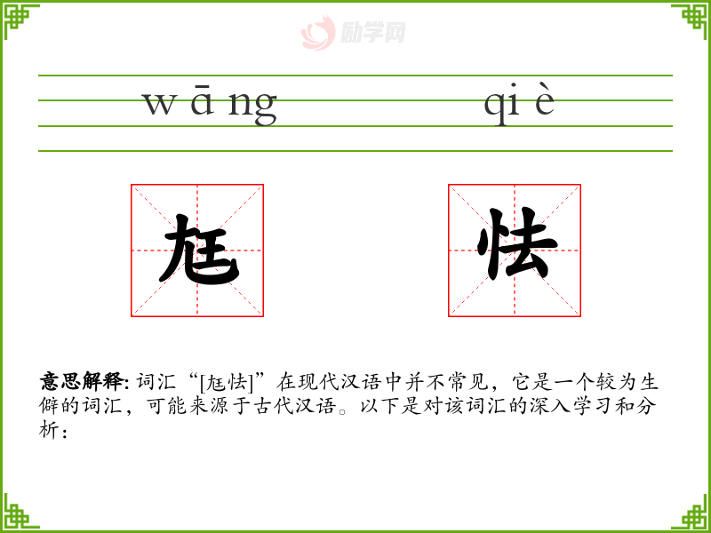词汇“[尪怯]”在现代汉语中并不常见,它是一个较为生僻的词汇,可能来源于古代汉语。以下是对该词汇的深入学*和分析: