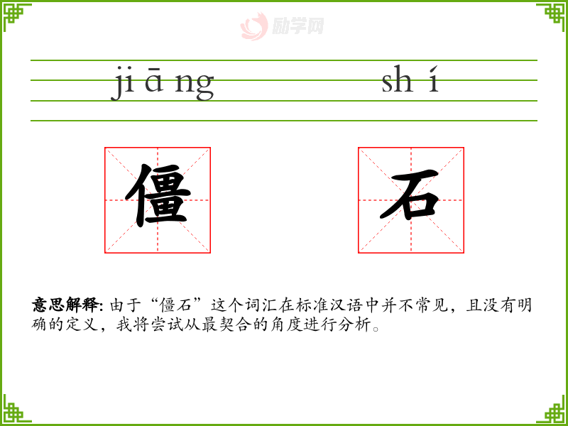 由于“僵石”这个词汇在标准汉语中并不常见,且没有明确的定义,我将尝试从最契合的角度进行分析。