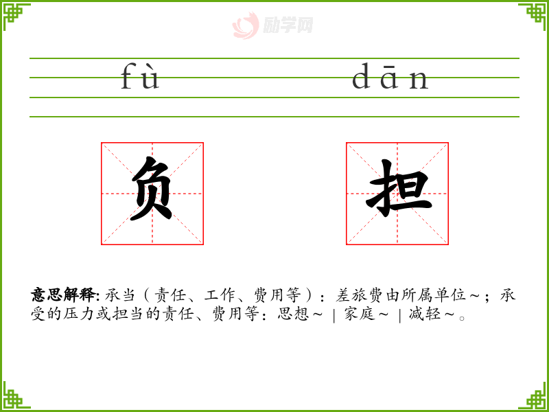 负担的意思是:承当(责任、工作、费用等):差旅费由所属单位~;承受的压力或担当的责任、费用等:思想~|家庭~|减轻~。