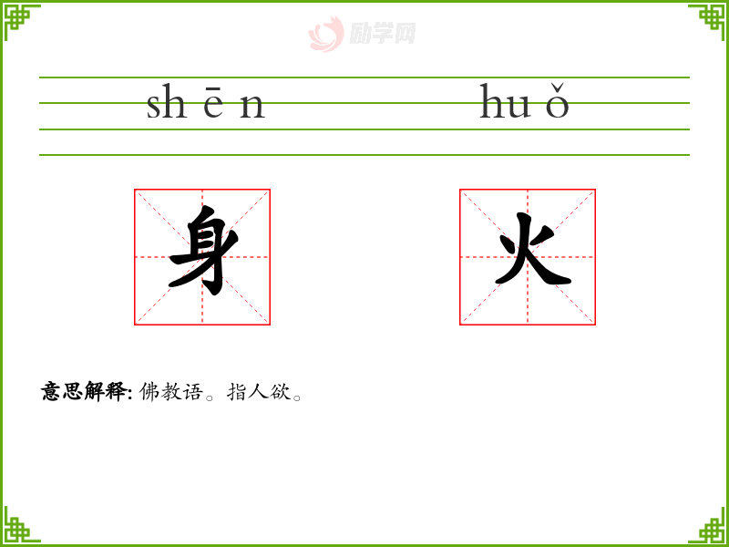 《说文》-火,南方之行也。炎而上,象形。 《春秋·元命苞》-火之为言委随也,故字人散二者为火也。 《易·说卦》-离为火。 《左传·昭公九年》-火水妃也。春秋感情符,火者阳之精也。 《论衡·诘术》-火,日气也。 《左传·宣公十六年》-人火曰火,天火曰灾。 《谷梁传·昭公九年》-国曰灾,邑曰火。 《公羊传·襄公九年》-大者曰灾,小者曰火。 宋·沈括《梦溪笔谈·活板》-火烧令坚。