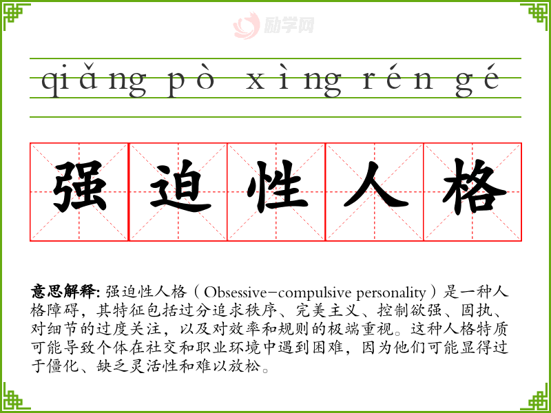 强迫性人格是一个复杂的心理学概念,它不仅影响个体的行为和思维模式,还可能影响他们的人际关系和社会功能。了解这个词的含义和应用,有助于更好地理解和管理与这种人格特质相关的行为。在语言学习和表达中,掌握这样的专业词汇可以增强我们的沟通能力和对人类行为的深刻理解。