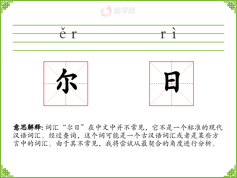 词汇“尔日”在中文中并不常见,它不是一个标准的现代汉语词汇。经过查询,这个词可能是一个古汉语词汇或者是某些方言中的词汇。由于其不常见,我将尝试从最契合的角度进行分析。