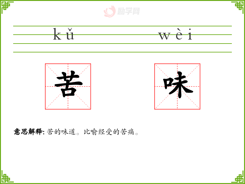 苦味的意思是:苦的味道。比喻经受的苦痛。