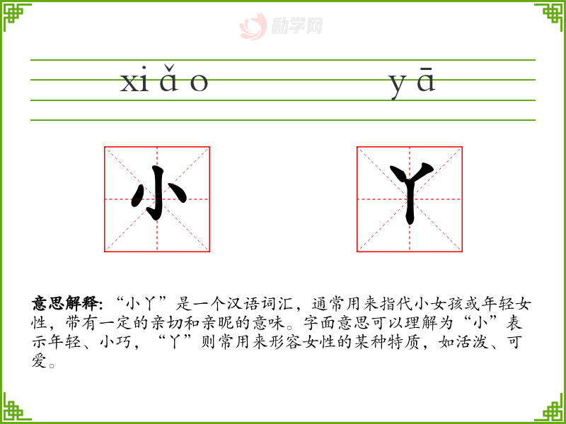 “小丫”是一个汉语词汇,通常用来指代小女孩或年轻女性,带有一定的亲切和亲昵的意味。字面意思可以理解为“小”表示年轻、小巧,“丫”则常用来形容女性的某种特质,如活泼、可爱。