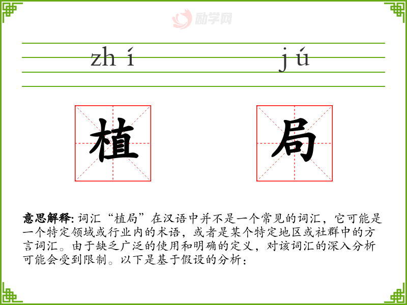 词汇“植局”在汉语中并不是一个常见的词汇,它可能是一个特定领域或行业内的术语,或者是某个特定地区或社群中的方言词汇。由于缺乏广泛的使用和明确的定义,对该词汇的深入分析可能会受到限制。以下是基于假设的分析: