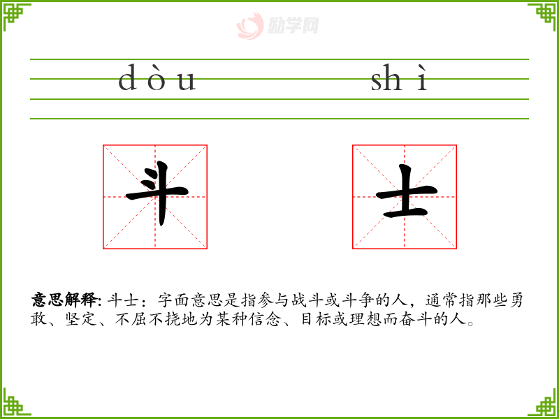 斗士:字面意思是指参与战斗或斗争的人,通常指那些勇敢、坚定、不屈不挠地为某种信念、目标或理想而奋斗的人。