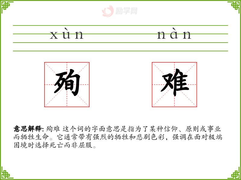 殉难的意思是:赴难;靖难; 为国家的危难而献出生命。