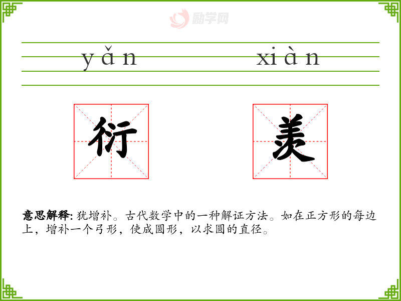 衍羡的意思是:犹增补。古代数学中的一种解证方法。如在正方形的每边上,增补一个弓形,使成圆形,以求圆的直径。