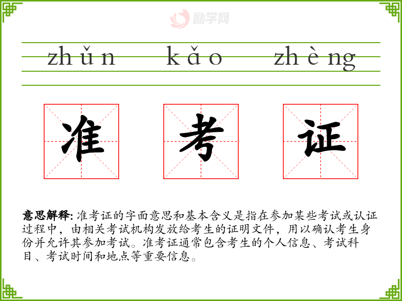 - 反义词:无(准考证是一个特定概念,没有直接的反义词)