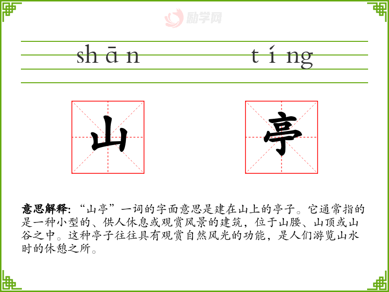 通过对“山亭”的学和分析,我更加理解了它在中华文化中的重要地位,以及它在文学和艺术中的多重象征意义。在语言学和表达中,掌握这样的词汇不仅能丰富我的词汇量,还能帮助我更好地理解和欣赏**传统文化。
