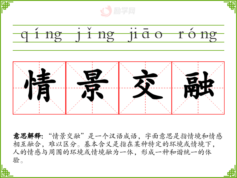 “情景交融”是一个汉语成语,字面意思是指情境和情感相互融合,难以区分。基本含义是指在某种特定的环境或情境下,人的情感与周围的环境或情境融为一体,形成一种和谐统一的体验。