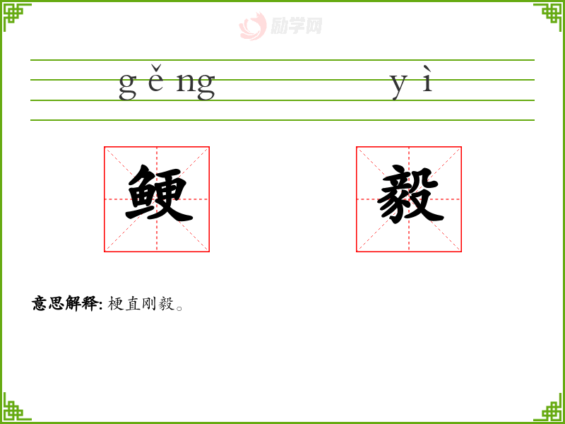 鲠[ gěng ] 1. (形声。从鱼(或从骨),更声。本义:鱼骨,鱼刺)。 2. 同本义。 【引证】 《说文》-鲠,鱼骨也。 【组词】 如鲠在喉,不吐不快 [更多解释]